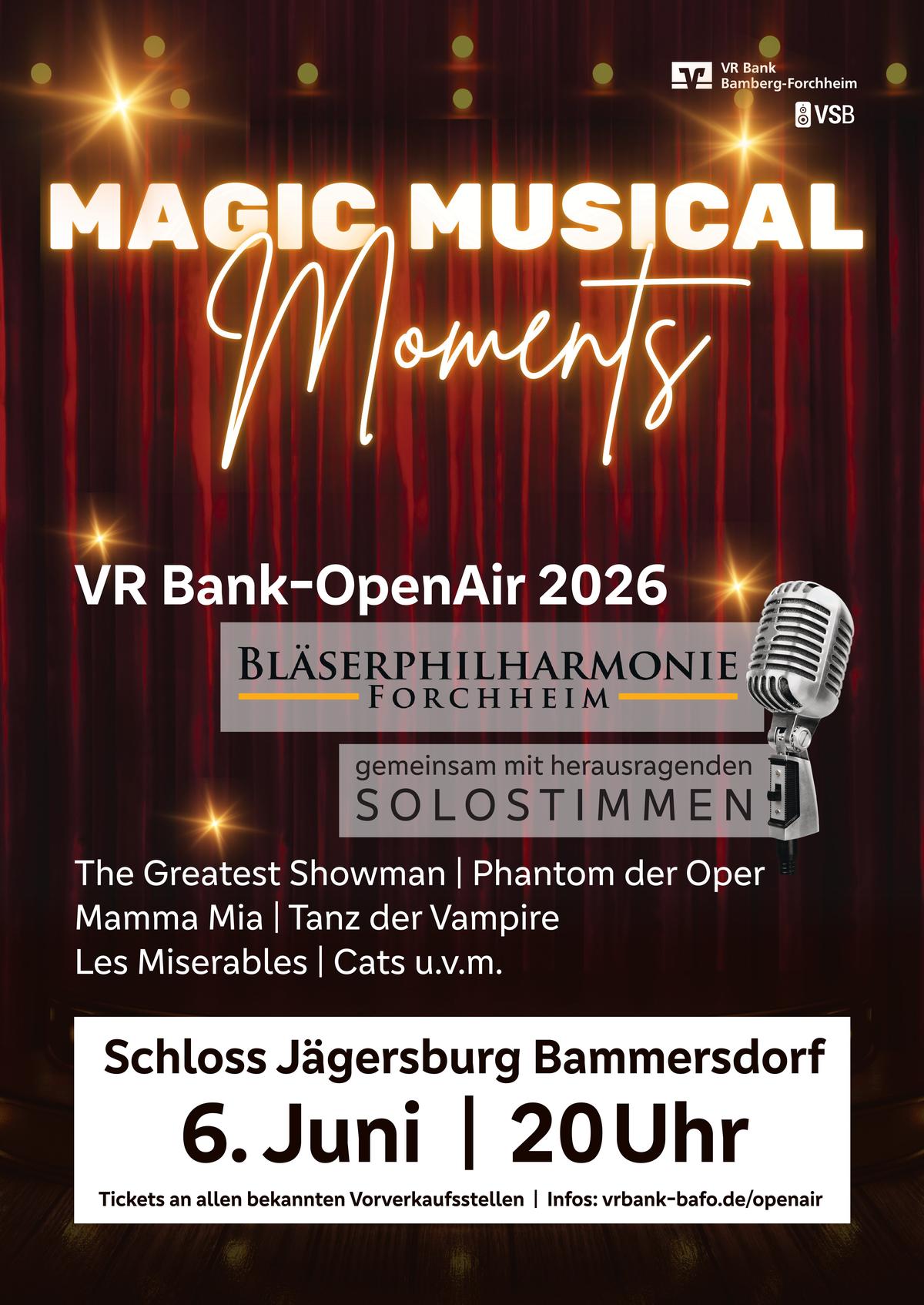 Die Bläserphilharmonie Forchheim lädt im Rahmen des VR Bank Open Air 2026 zu einem musikalischen Sommerabend ein: Unter dem Titel „Magic Musical Moments“ präsentiert das Orchester ein großes Open-Air-Konzert in der atemberaubenden Kulisse von Schloss Jägersburg.