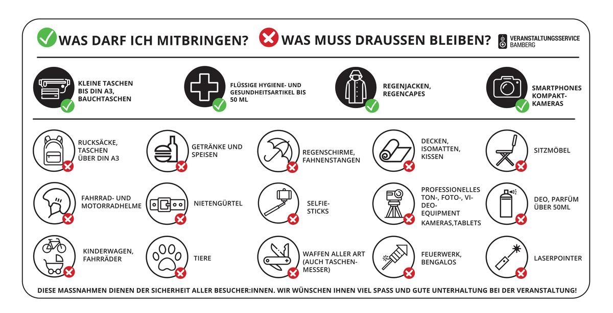 Zur Sicherheit aller Beteiligten werden am Einlass strenge Taschenkontrollen durchgeführt. Taschen sind nur bis max. DIN A3 Format zugelassen! Allgemein gilt: Je kleiner die Tasche, desto schneller die Kontrolle. Packen Sie also nur das Nötigste ein, um lange Wartezeiten zu vermeiden. Bitte achten Sie außerdem darauf, keine verbotenen Gegenstände mitzubringen! Bitte nehmen Sie darüber hinaus weder Essen noch Getränke mit aufs Gelände, vor Ort ist reichlich Gastronomie vorhanden.