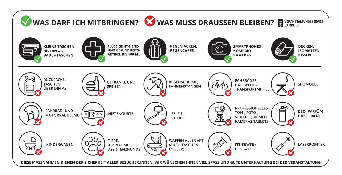 Zur Sicherheit aller Beteiligten werden am Einlass strenge Taschenkontrollen durchgeführt. Taschen sind nur bis max. DIN A 4 Format zugelassen! Allgemein gilt: Je kleiner die Tasche, desto schneller die Kontrolle. Packen Sie also nur das Nötigste ein, um lange Wartezeiten zu vermeiden. Bitte achten Sie außerdem darauf, keine verbotenen Gegenstände mitzubringen! Bitte nehmen Sie darüber hinaus weder Essen noch Getränke mit aufs Gelände, vor Ort ist reichlich Gastronomie vorhanden. Anbei finden Sie einen Überblick dazu.