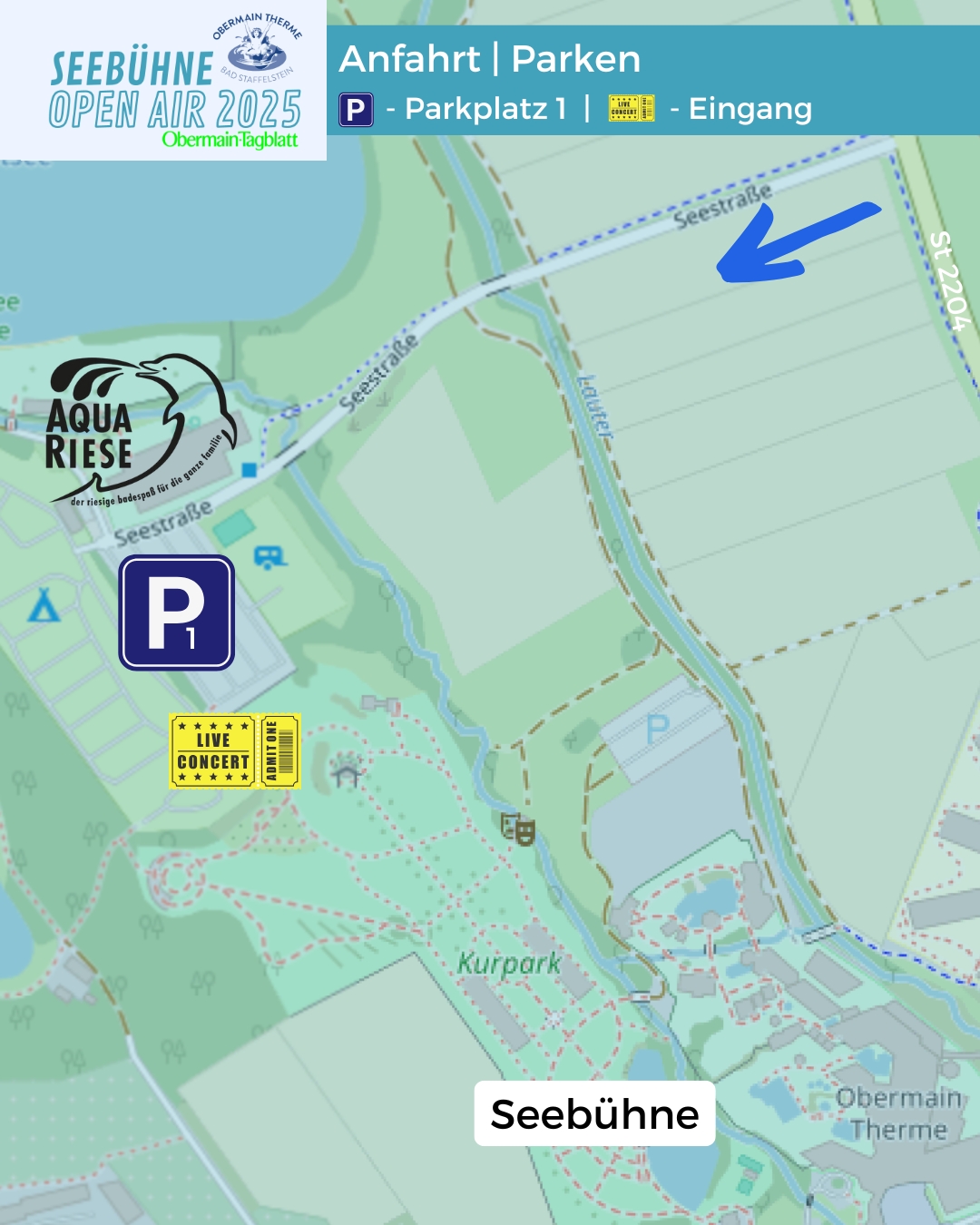 Bitte nutzen Sie vorrangig die Parkmöglichkeiten auf dem Parkplatz Seestraße beim AquaRiese – hier befindet sich ebenfalls ein Eingang zur Seebühne. Wichtig: Beachten Sie bitte die Verkehrsregeln, um einen reibungslosen Ablauf zu gewährleisten.